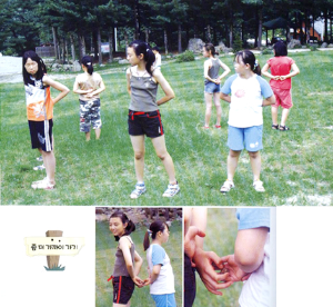 3. 손을 뒷짐진체로 다른 사람의 등 뒤로 가서 등을 마주 하고 손에 있는 열매를 서로 만져보며 같은 열매 짝을 찾는다.