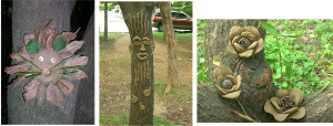 2. 그 나무의 모양이나 수피, 나뭇잎 등을 살펴보고 나무에게서 받은 느낌이나 나무의 표정을 생각해서 그 나무에게 어울리는 표정이나 나무와 함께 살아가는 여러 자연의 친구들을 찰흙과 주변의 자연물을 이용하여 나무에 멋지게 꾸며준다.